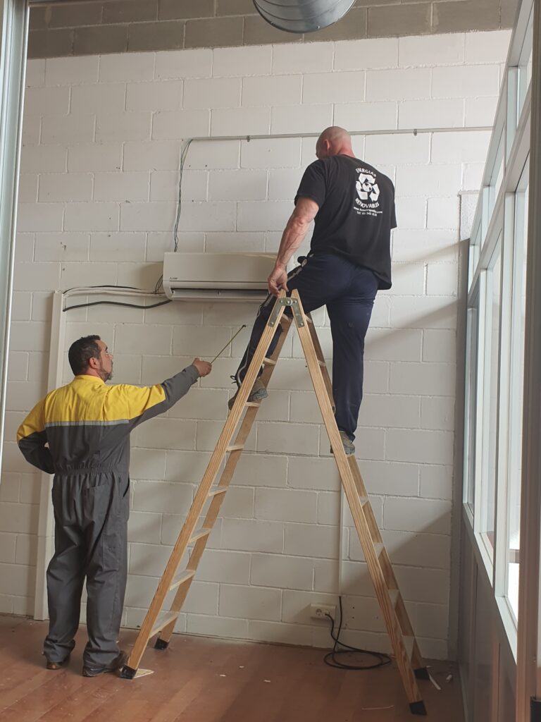 Foto detalle de una de las dos unidades de aire acondicionado durante su instalacion actuamente desaparecidas.