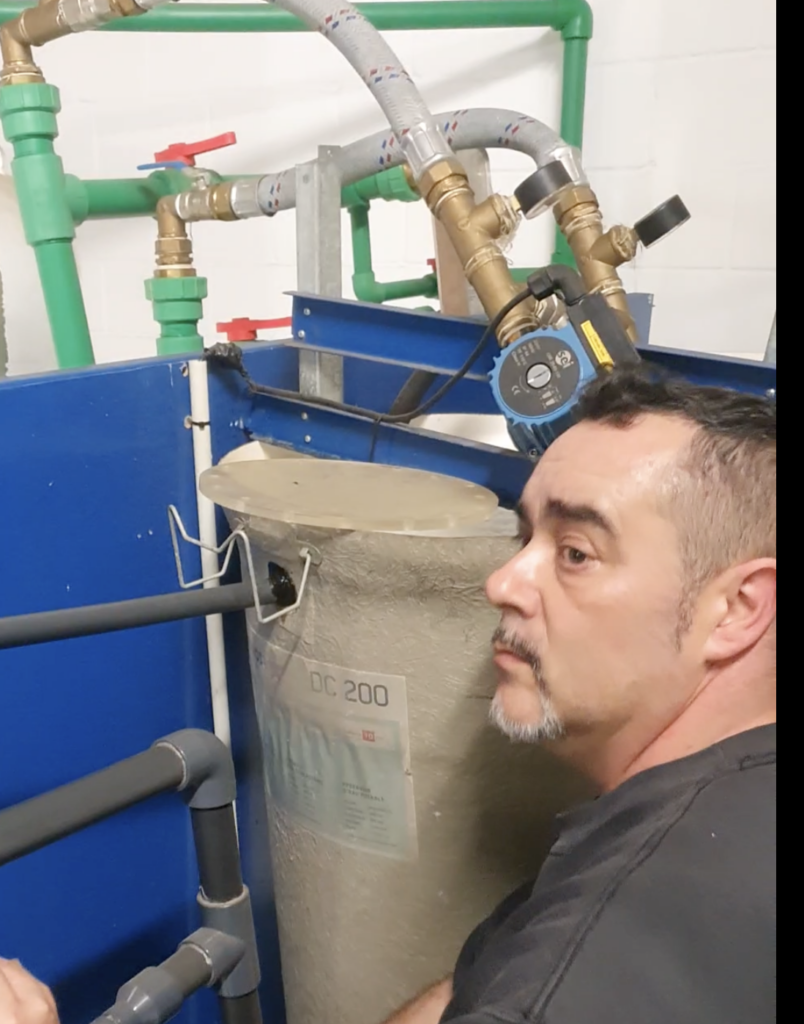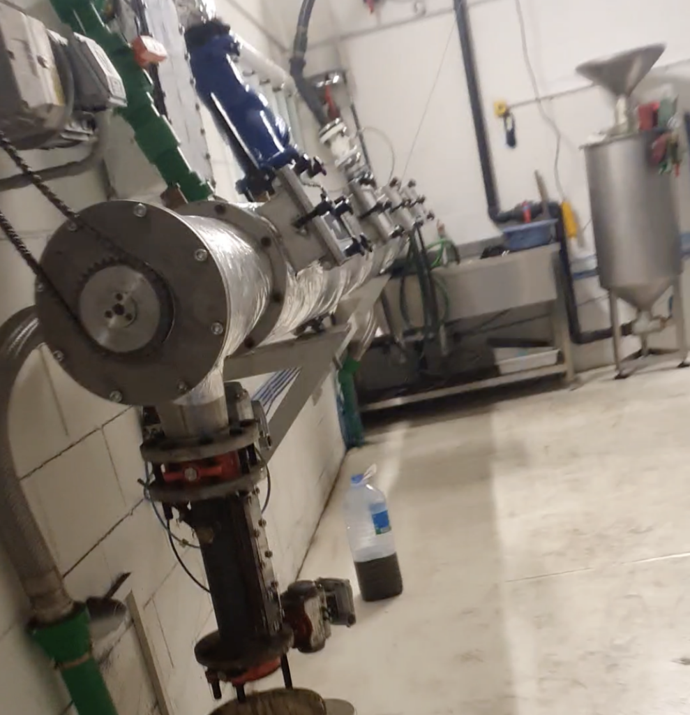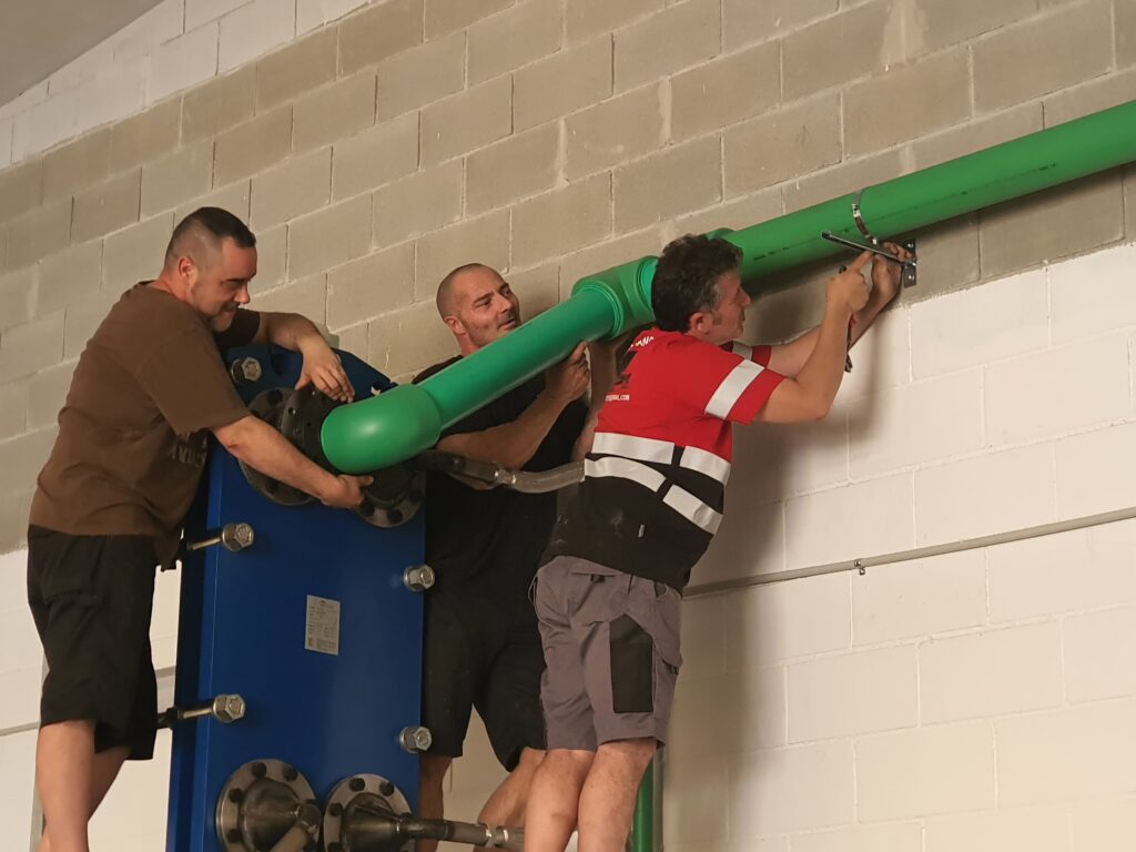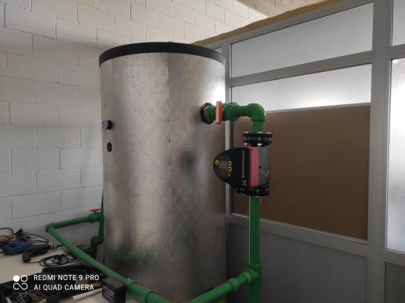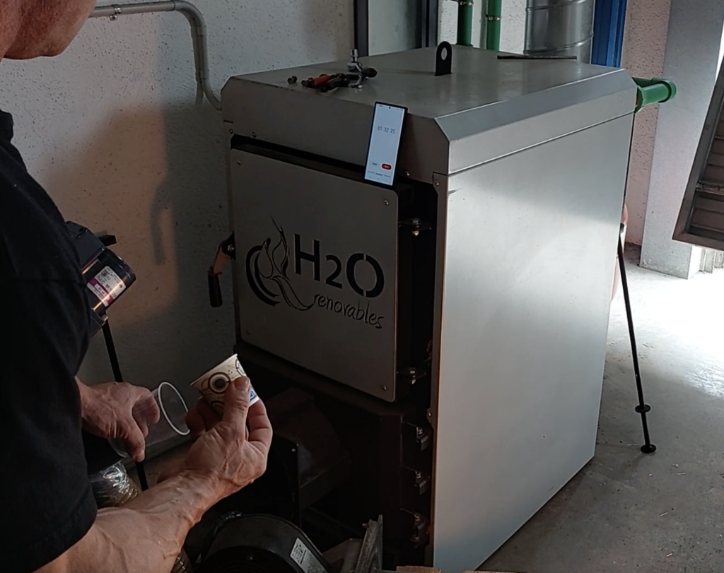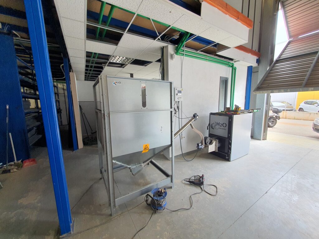 Una caldera de biomasa, visible en la foto a mano derecha y un deposito de biomasa, visible a mano izquierda, ambos de la marca H20 renovables.