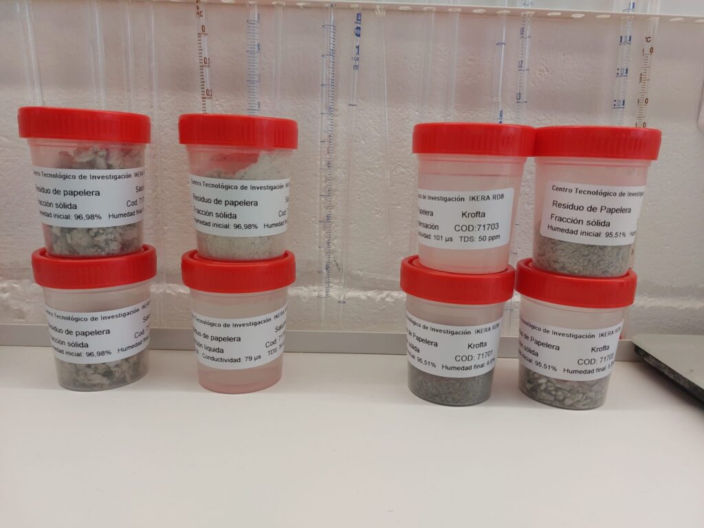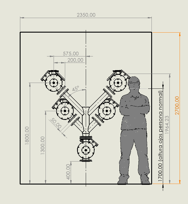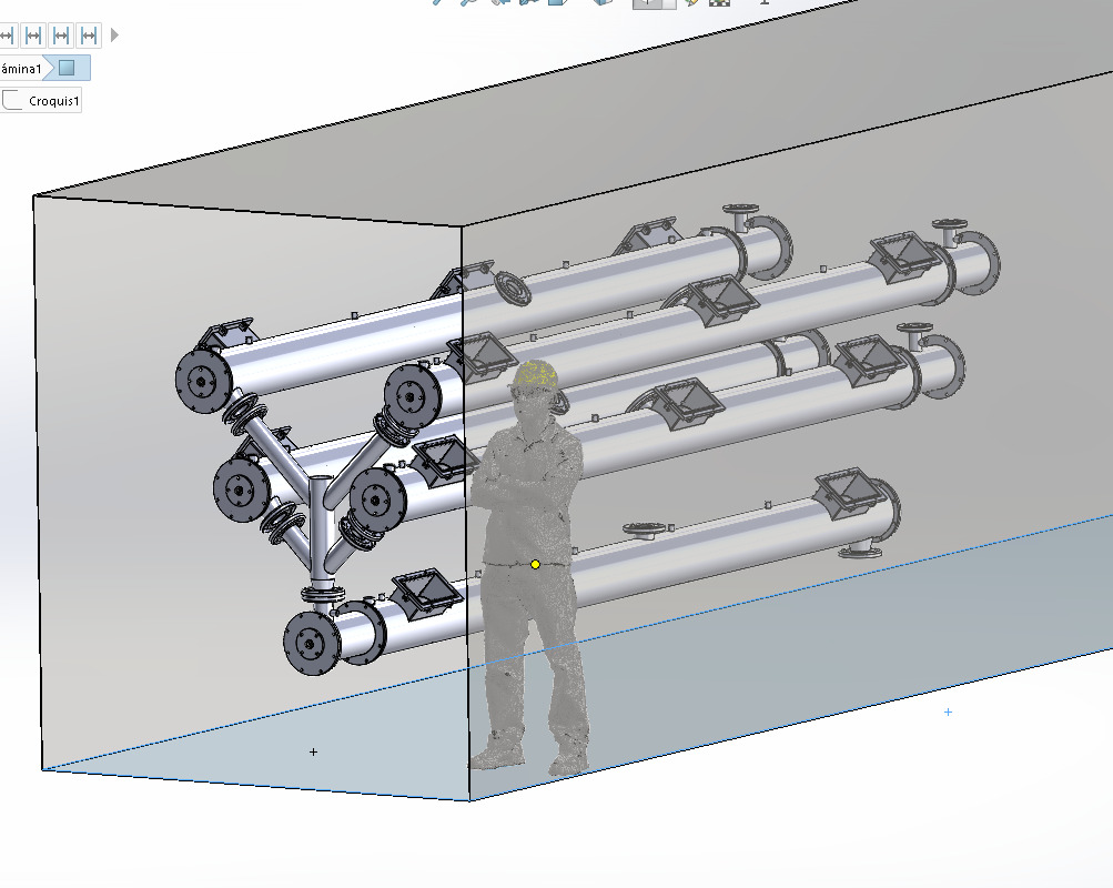 Detalle de los cinco tubos dentro del contenedor en relacion a una persona en vista diagonal.